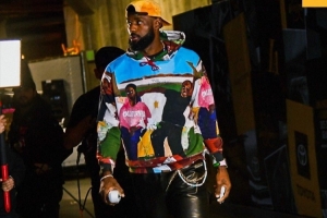 賽前,湖人官推曬球員入場(chǎng)照,詹姆斯花哨著裝十分吸引眼球,東契奇墨鏡酷帥。