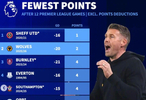 德轉(zhuǎn)統(tǒng)計了英超歷史上,12輪過后積分最低的球隊榜單(不含罰分)。