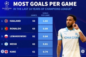 體育資訊11月26日訊 馬賽在本輪歐冠2-1逆轉(zhuǎn)紐卡斯?fàn)?,奧巴梅揚(yáng)梅開二度。《轉(zhuǎn)會市場》統(tǒng)計顯示,他也是近10年歐冠場均進(jìn)球榜前十。
