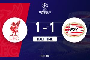 上半場傷停補時1分鐘,半場結束,利物浦暫1-1埃因霍溫。