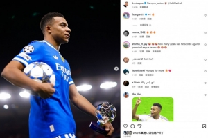 本場比賽姆巴佩上演大四喜,賽后他也在社媒曬出拿走比賽用球和全場最佳獎杯的照片,配文寫道:“永遠(yuǎn)團(tuán)結(jié)一致,皇馬加油!”