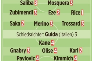 體育資訊11月27日訊 拜仁在本輪歐冠客場(chǎng)1-3不敵阿森納,《圖片報(bào)》在賽后為兩隊(duì)將帥評(píng)分。