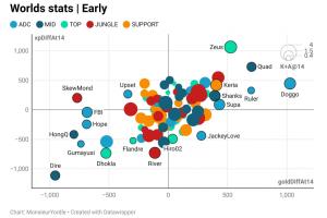 體育資訊10月21日訊?外媒發(fā)布截至目前世界賽前14分鐘經(jīng)濟(jì)差與經(jīng)驗(yàn)差數(shù)據(jù)圖(其中橫坐標(biāo)代表經(jīng)濟(jì)差,縱坐標(biāo)代表經(jīng)驗(yàn)差,圖中圓圈大小代表14分鐘的擊殺與助攻數(shù)的平均值,以4、1.5、0.4為節(jié)點(diǎn)):Zeus經(jīng)驗(yàn)差最高;Doggo經(jīng)濟(jì)差最高。