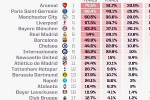 體育資訊10月21日訊 歐冠聯(lián)賽階段第三輪開賽在即,opta超級計(jì)算機(jī)更新了歐冠奪冠概率,其中阿森納位列榜首,巴黎、曼城分列二三。