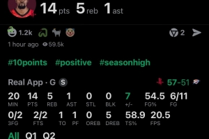 他上半場(chǎng)多次在打不開(kāi)局面的情況下強(qiáng)行解決問(wèn)題,20分鐘的時(shí)間里,投籃11中6,三分球2中0,罰球2中2,拿下全隊(duì)最高的14分外加5籃板1助攻的數(shù)據(jù),正負(fù)值+7。